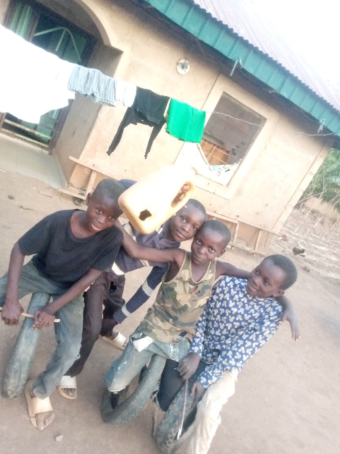 Four young males are depicted in an outdoor setting in Agban, Nigeria