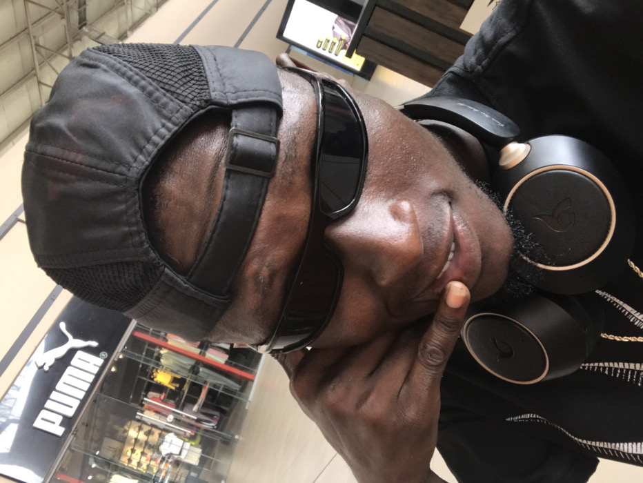 The image depicts a close-up, self-portrait of a dark-skinned male subject inside a shopping mall located in Ikeja, Nigeria