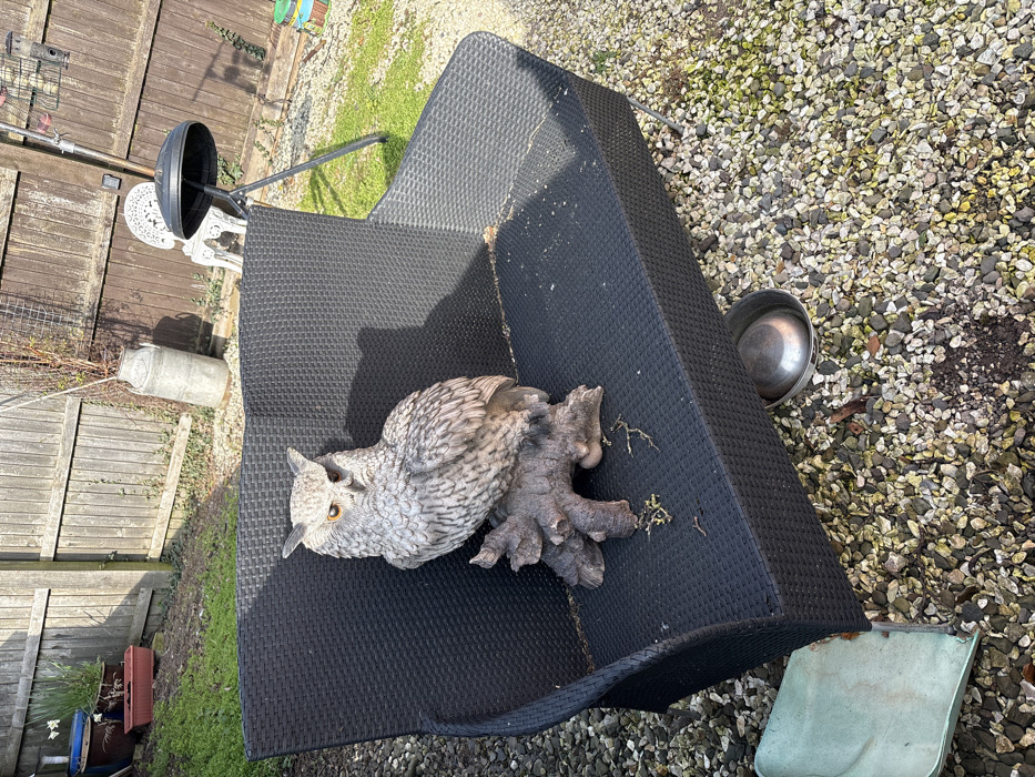 An outdoor scene in Annscroft, United Kingdom, displays a grey and brown owl statue perched on a faux tree stump base