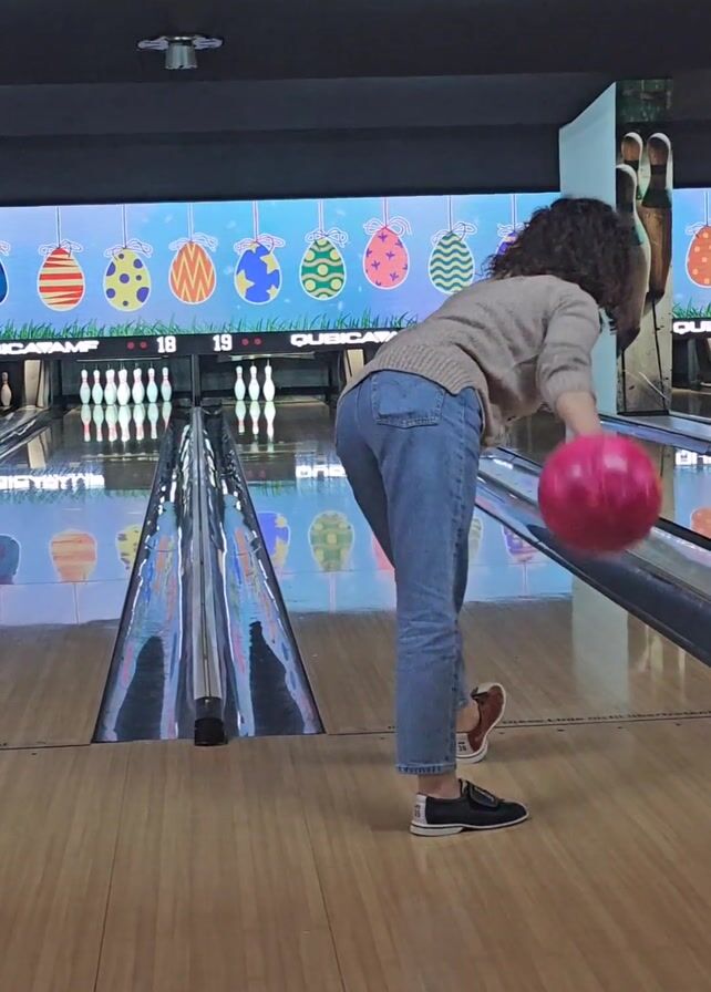 woman bowling in a bowling alley. She is facing away from the camera and holds a pink bowling ball. She bends over and releases the ball down the lane. The ball travels towards the pins, but it's hard to see the result. The bowling alley has a wooden floor and a digital scoreboard with a colorful Easter egg theme. Other lanes are visible in the background. The woman is wearing jeans, a tan sweater, and bowling shoes.
