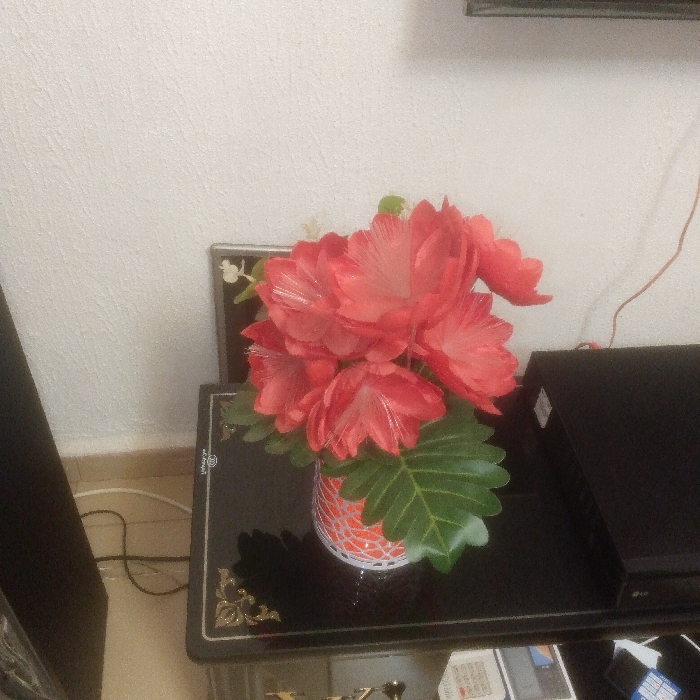 The scene is identified as an indoor environment in Abakaliki, Nigeria. A decorative arrangement occupies the central foreground, consisting of multiple artificial flowers exhibiting coral-to-red hues, interspersed with several prominent green leaves. The flowers display a multi-layered petal structure, with some featuring fine white fibrous details. The flowers are contained within a cylindrical vase, predominantly white with an overlay of orange, possibly wicker-patterned, texture. The vase rests on a black, high-gloss table. The table's edge is adorned with ornate gold-colored metallic accents, particularly visible on the left side. The table surface exhibits reflections. To the right of the floral arrangement, a black electronic component, rectangular in form and possibly an LG brand media player, is positioned on the table. The background features a uniformly light-colored, textured wall. A thin, rust-colored wire extends vertically along the wall on the right. A white power cable is visible on the floor line to the left. A large, dark, vertical object, possibly an audio speaker, is partially visible in the far left of the frame. Additional indistinct objects, including what appears to be a remote control and papers, are partially visible on the table surface in the lower right. No human subjects or direct interactions are observable within the depicted frame.