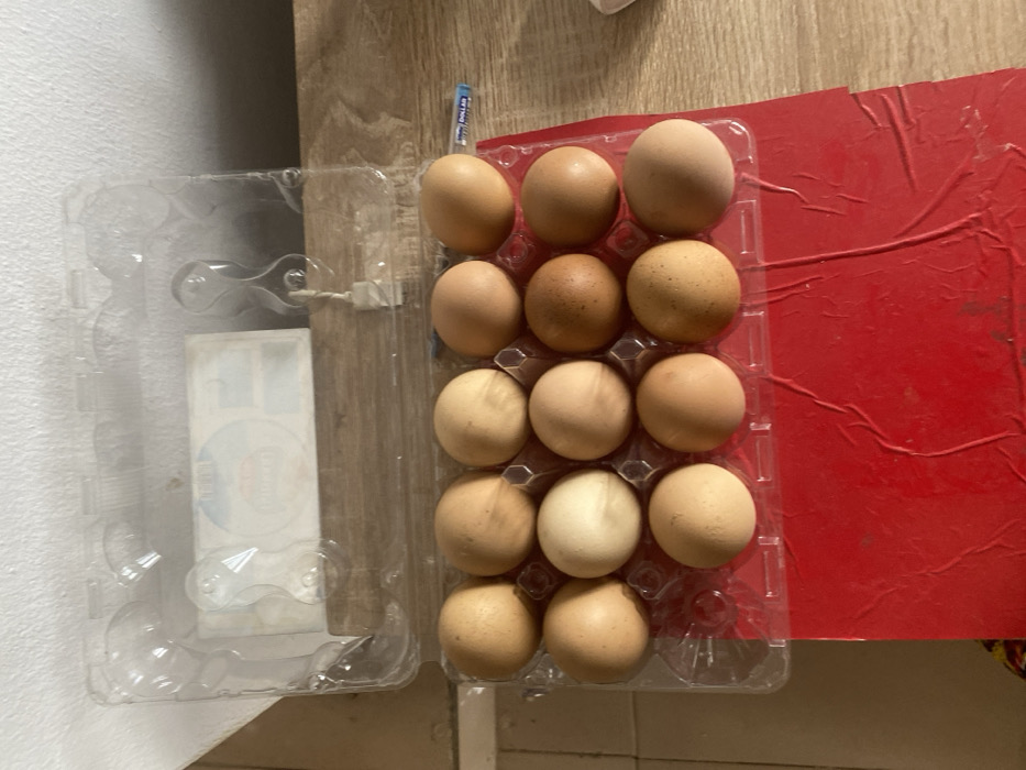 - "The scene depicts a clear plastic egg carton holding twelve eggs, positioned on a crinkled red surface" by FM-BPBpZ2, licensed under CC BY 4.0