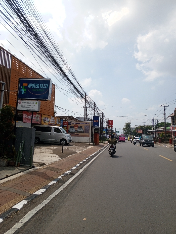 The image depicts an urban street scene. Based on the Indonesian language present on prominent signs, specifically "APOTEK FAZZA PANEMBONG" (Pharmacy Fazza Panembong) and "PRAKTEK DOKTER SPESIALIS ANAK" (Pediatrician's Practice), the location is identified as a city in Indonesia, not Multhan, India. The scene features a two-lane asphalt road with a solid yellow center line and white edge lines, alongside a brick sidewalk. Numerous utility poles densely strung with overhead electrical and communication cables line both sides of the street. On the left, a multi-story building with a brown, slatted facade displays the "APOTEK FAZZA" sign. Adjacent to it, a silver minivan is parked on a paved area. In the foreground on the left, a dark grey rectangular pillar stands on the sidewalk. On the road, a single individual wearing a light-colored top and helmet is operating a black scooter, moving away from the camera. Further down the road, additional vehicles are visible, including a pink car, a dark SUV or minivan, and other motorcycles, indicating active traffic flow. Buildings with various commercial signage, including "ZUKO," extend into the background on both sides of the road. The sky is partly cloudy and bright.