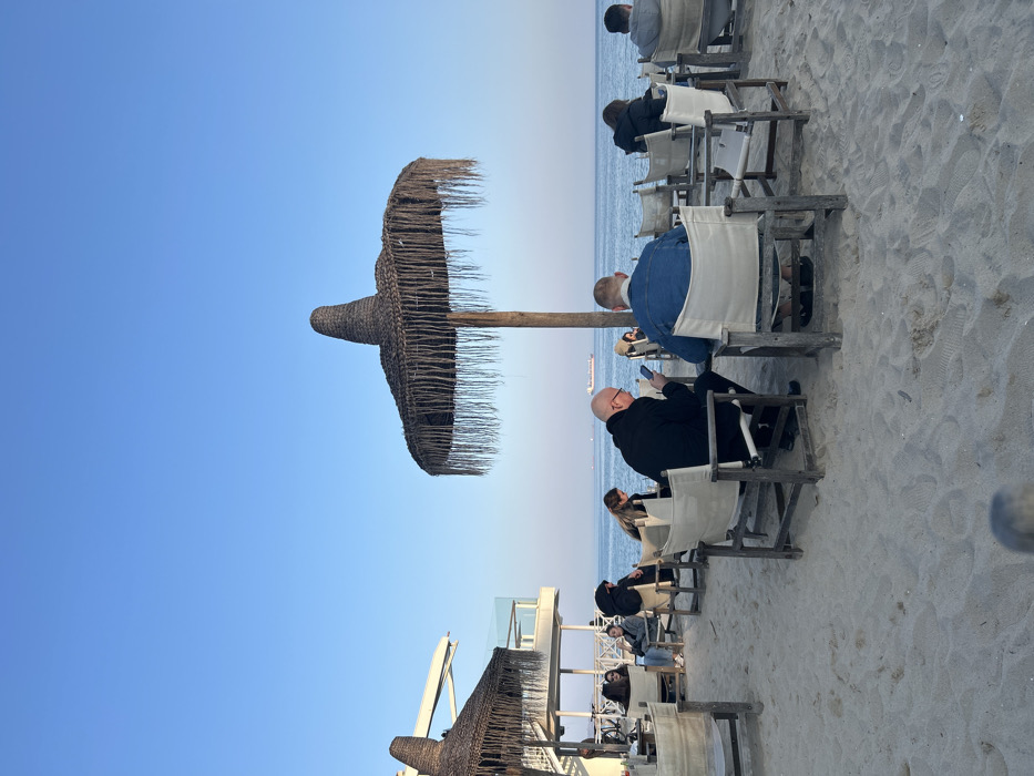 The image depicts an outdoor beach bar setting, identified as Cubo Beach Bar, located on the South Beach of Varna, Bulgaria. The scene is set on a sandy beach under a clear, light blue sky. In the mid-ground, a prominent, large conical thatched umbrella with dark straw fringe stands on a wooden pole. A similar, partially visible umbrella structure is positioned to the left. To the far left, a portion of a modern, multi-level building with white facades and glass railings is visible, indicating the primary structure of the bar or restaurant. Multiple individuals are seated in outdoor director-style chairs featuring light-colored fabric seats and wooden frames, arranged across the sand. In the foreground-middle, two men are seated with their backs partially towards the viewer. The man on the left is bald, wearing a dark coat, and is looking down at a smartphone held in his hands. The man on the right wears a blue denim jacket. Further into the mid-ground and background, other patrons are seated in similar chairs, some facing the sea, others in small groups. The Black Sea forms the background horizon, appearing calm under the clear sky. A distant cargo ship or vessel is visible on the water. No direct interactions or specific activities between the seated individuals are clearly discernible beyond their presence in the establishment.