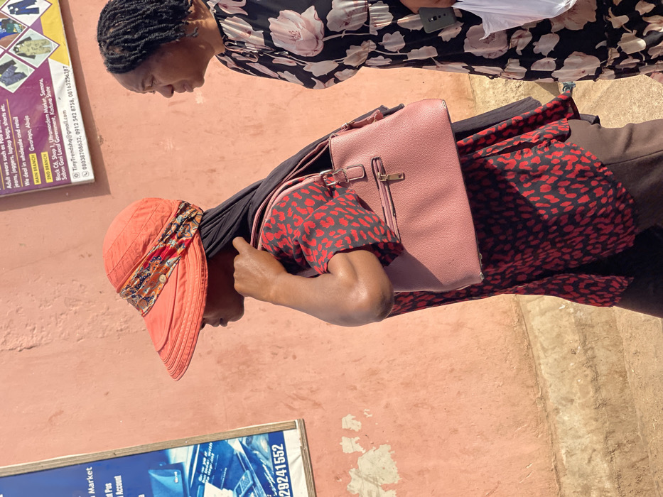Two adult females are depicted walking from left to right on a sunlit street in Samaru, Nigeria. The background consists of an aged, peach-colored wall with peeling paint, featuring two attached advertising signs. The sign on the right, partially visible, advertises "TinyTrendsHQ" and lists "Ultramodern Market, Samaru, Sabon Gari Local Government, Kaduna State" as a branch location. The sign on the left, also partially visible, is blue and white, displaying "Market" and numbers including "29241552." The woman in the foreground wears an orange wide-brimmed sun visor adorned with a multi-colored patterned band, covering her forehead and eyes. A dark fabric, possibly a headscarf, is visible beneath the visor. She wears a short-sleeved top with a red and black abstract or cheetah-like pattern, and dark trousers. A light pink/mauve rectangular handbag with gold-colored zippers and clasps is slung over her right shoulder. Her right arm is bent, with her hand positioned near her shoulder. The second woman, positioned behind and to the right of the first, is partially visible. She wears a black dress with a large white or light pink floral pattern and a ruffled neckline. Her hair is styled in dark dreadlocks or braids. Her left hand is visible, holding a white object, possibly a smartphone, with a dark-colored case. Both individuals are walking in a parallel trajectory. The ground appears to be a light-colored, possibly paved or dirt, surface, illuminated by direct sunlight.