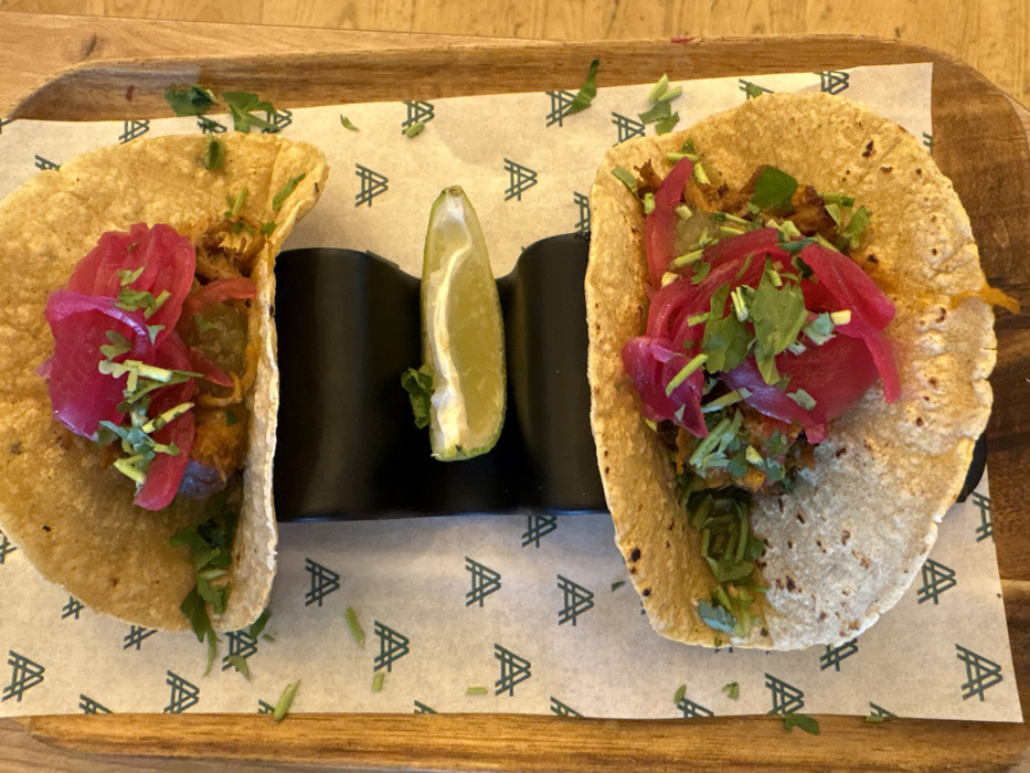 An overhead shot displays two prepared tacos served on a light-colored wooden tray