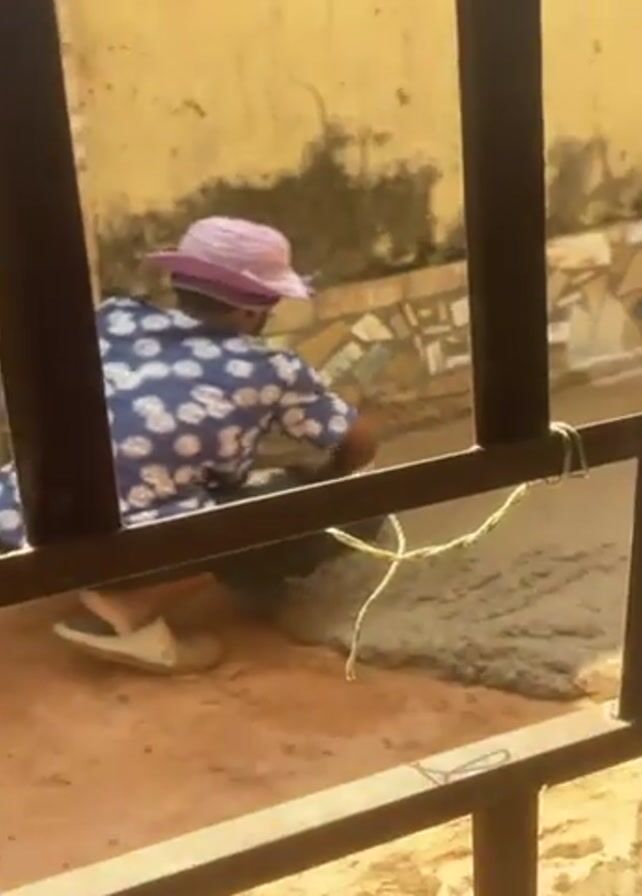 A person wearing a pink hat, a blue shirt with white flowers, and jeans is crouching and spreading cement on the ground with a trowel. They are seen through a dark metal railing, and another person wearing an apron walks in front of the railing, partially blocking the view. The ground is reddish dirt. There is a rope tied to the railing. A wall with a mosaic pattern is in the background.