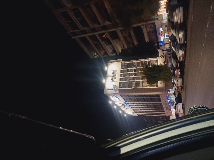 A nighttime street scene displays a multi-story building with lit signage. Several parked cars line the street. A taller, skeletal structure looms above the building. The shot is taken from inside a vehicle, with part of the dashboard and frame visible. The overall perspective is slightly tilted.