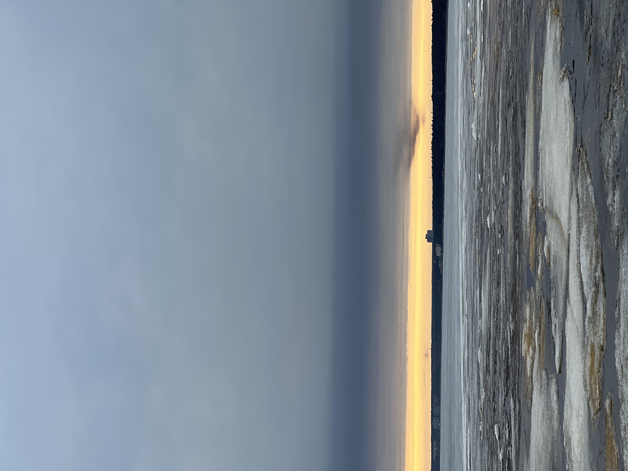 The image depicts a horizontally oriented landscape with the sky taking up the left half and the ground (possibly a frozen body of water) taking up the right