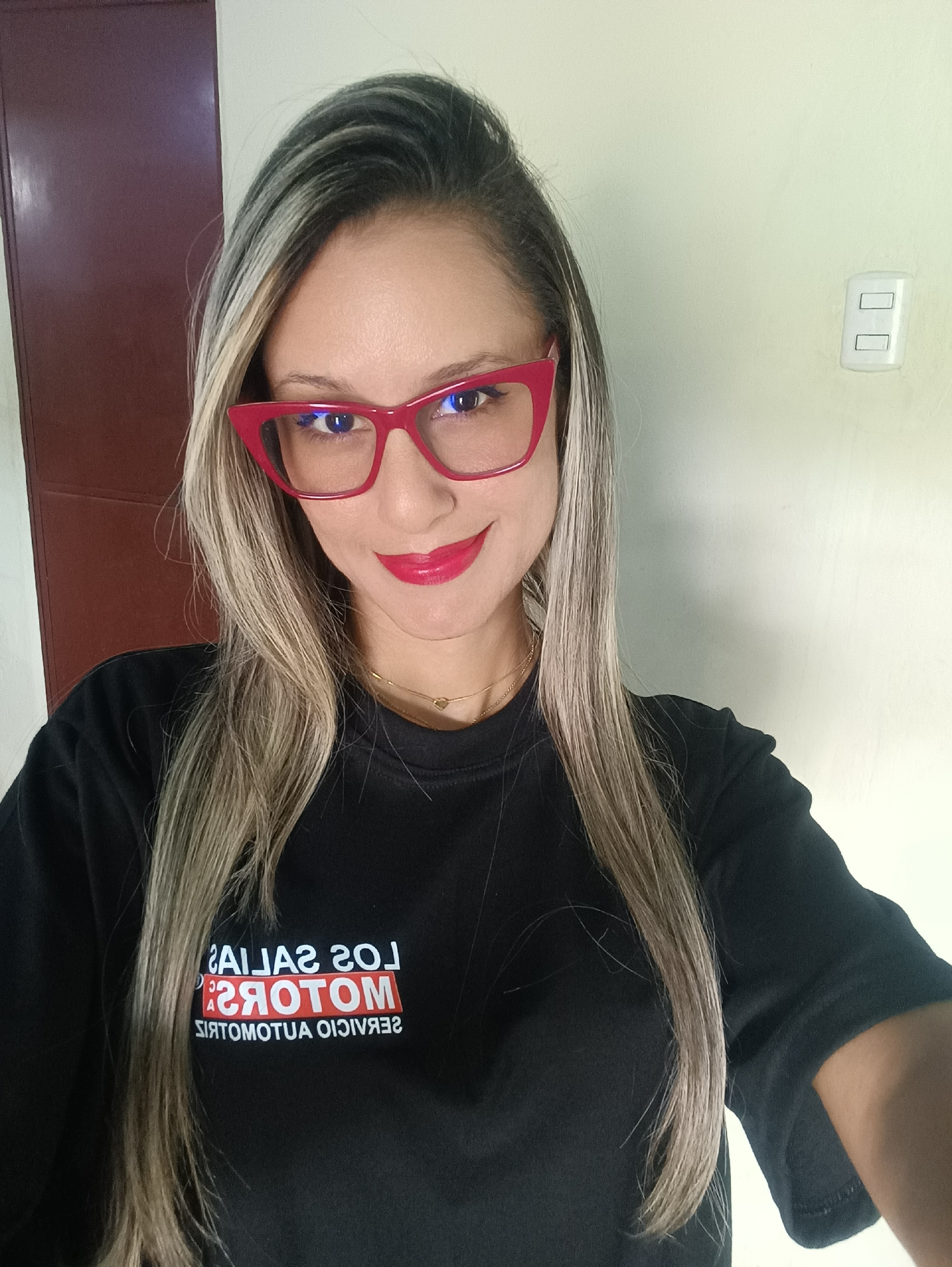 A woman with light brown and blonde highlighted hair, wearing red-framed glasses and red lipstick, is posing for a selfie. She is wearing a black t-shirt with white and red lettering that reads "LOS SALIAS AUTOMOTORES SERVICIO AUTOMOTRIZ" (The Salias Motors Automotive Service) in reverse. The background consists of a light-colored wall and a dark-colored door. There is also a white electrical outlet or switch on the wall. The name "Los Salias" indicates a connection to the city of Las Tejerías, Venezuela.