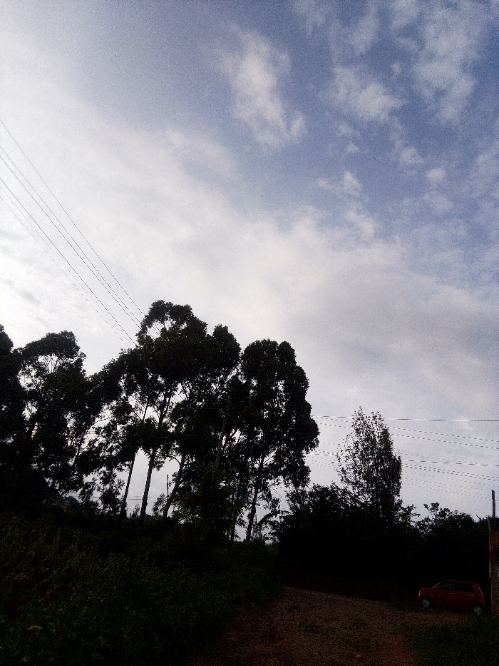 The image depicts an outdoor scene in Nachu ward, Kenya, dominated by natural elements and utility infrastructure under a partially cloudy sky. The upper approximately 60% of the frame features a light blue-grey sky with scattered white cumulus clouds. Five parallel power lines traverse the upper left quadrant, angling downwards from left to right. The middle and lower-middle sections are filled by a dense cluster of tall trees, characterized by dark, full foliage, which are silhouetted against the lighter sky and extend across the width of the frame. One distinct tree with a narrower canopy is visible slightly to the right of the main tree cluster. The lower approximately 20-30% of the image shows a reddish-brown dirt track or unpaved road, which curves slightly to the right and recedes into the background. Dense, dark green vegetation covers the immediate foreground and parts of the area adjacent to the track. A small, red passenger vehicle, appearing to be a hatchback, is parked or situated on the right side of the dirt track, partially obscured by the surrounding vegetation. No individuals are visible, and no specific actions or interactions are depicted within the scene.