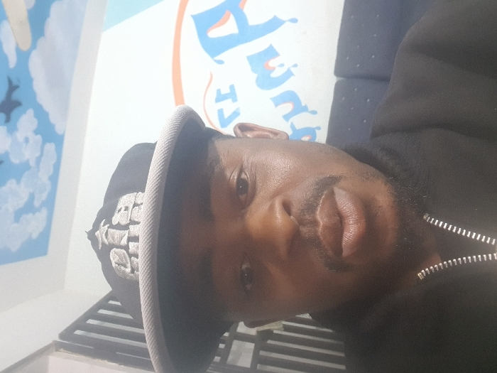 A man with dark skin wears a black baseball cap with white lettering and a grey brim. He has dark eyes, a mustache, and a hint of a beard. A silver zipper is partially visible on his black jacket. The background features a blue and white mural, possibly depicting clouds and airplanes, and a curved blue and orange graphic. He appears to be seated in front of a dark-colored, textured surface.