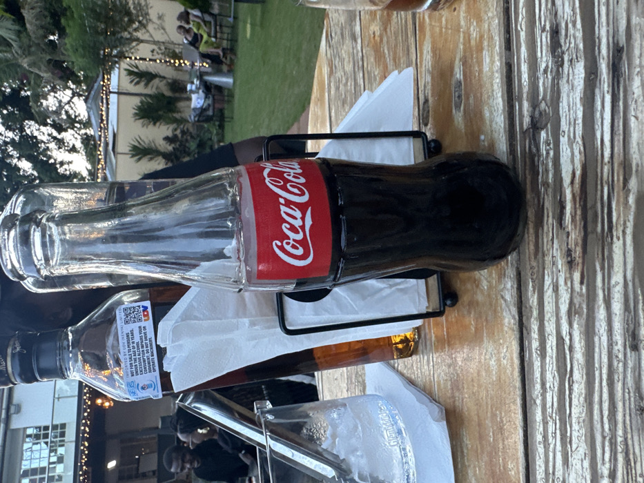On a light wooden table sits a Coca-Cola bottle in a black metal stand with white napkins. Next to it, a bottle of alcohol displays a government warning: "IMPORTED BY GOV (KENYA) LIMITED. NOT FOR SALE TO PERSONS UNDER THE AGE OF 18 YEARS. EXCESSIVE ALCOHOL CONSUMPTION IMPAIRS YOUR JUDGMENT OR HAS UPDATED MACHINERY." A glass of amber liquid and another glass containing ice are visible in the foreground. In the background, there is a blurry outdoor scene with people and plants.