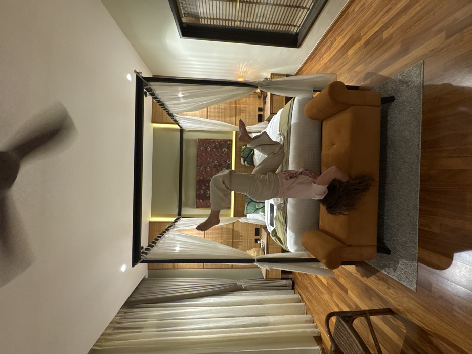 Within a well-appointed bedroom in George Town, Malaysia, a person is depicted performing an inverted pose on an orange upholstered bench. The individual, wearing a light t-shirt and light long pants, has their head positioned on the bench, with their long brown hair cascading downwards, while their legs are bent and elevated towards the ceiling. The bench, which features dark legs and tufted upholstery, rests on a light grey rectangular rug. Behind the person and bench is a large four-poster bed with a dark metal frame draped with white sheer canopies. The bed is made with white bedding, a green bed runner, and two pillows adorned with green leaf patterns. A dark-colored laptop or tablet rests on the bed. Flanking the bed are two light-colored wooden bedside tables, each holding small objects. The wall behind the bed features horizontal light-colored woven paneling, illuminated by vertical warm-toned light strips. A rectangular artwork with a dark red and multi-colored patterned design hangs above the bed. The walls are painted a light green hue. To the left, floor-to-ceiling sheer and cream-colored curtains cover a window. A woven chair is partially visible in the bottom left corner. To the right, a tall, narrow window with dark framing is fitted with wooden blinds. The room features polished, warm-toned hardwood flooring and a plain white ceiling with recessed lighting. A dark, blurred ceiling fan is visible in motion at the top of the frame, indicating movement.