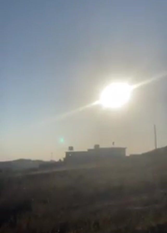 landscape with a building in the middle ground under a bright sun. The sky is a clear, pale blue. The foreground consists of dry, brown grass and shrubbery. In the middle distance, there is a silhouette of a building with what appears to be water tanks on its roof. There are also some rolling hills in the background. The sun is high in the sky, creating a bright glare. The wind is audible in the recording.