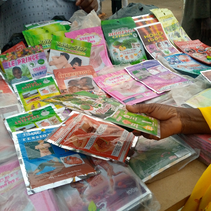 A person is holding a package of "Special Pure Moringa Citron" tea amidst a crowded display of herbal teas and remedies. Other products include "Le Prince Tisane Energie," "Koko-Stop Hemorroides," "Secret de Femme," "Koko 100%," "Infection Naturel," "Tisane Tension," and "Tisane Antibiotique." The packaging features graphic imagery related to the product's supposed benefits, alongside product names in French and health claims. The overall impression is that it's a market stall selling various herbal remedies.