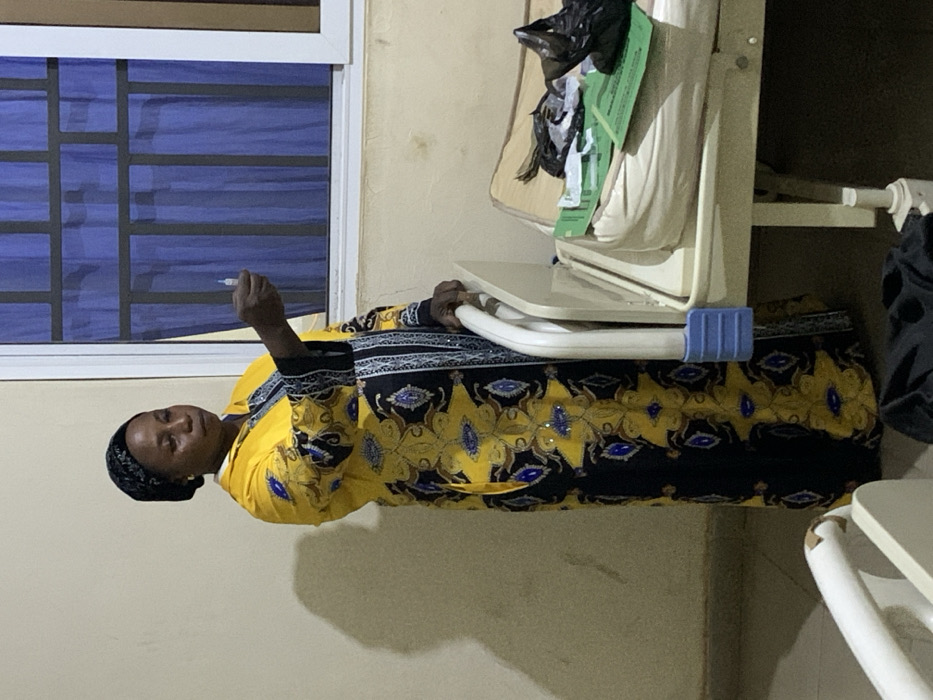 An African woman in a yellow and black patterned dress sits next to an adjustable hospital bed. She is holding a small object in her hand, possibly a pen or cigarette. Behind her is a window with blue blinds. A hospital bed table is positioned in front of her, supporting a small collection of items. The room appears to be a hospital or care facility.