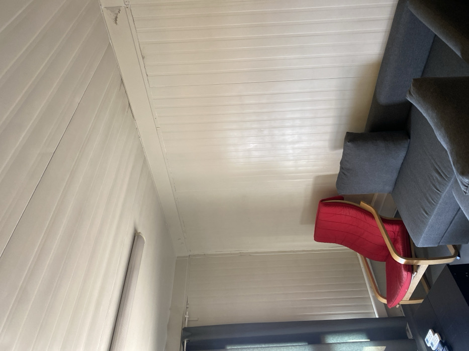 The image depicts an interior room in Inupa Kekere, Nigeria. The room features light-colored, possibly off-white, vertical paneling on the walls and horizontal paneling on the ceiling, suggesting a modular or prefabricated construction. A single, linear fluorescent light fixture is mounted centrally on the ceiling. In the left foreground, a dark grey or black vertical blind partially covers a window, allowing natural light to enter and cast reflections on the walls. Furniture in the room includes a red upholstered armchair with a light-colored wooden frame, positioned in the middle-left. To its right, a dark grey modular sofa or sectional occupies the foreground and right side of the image, featuring multiple cushions. A rectangular black table, possibly a coffee table, is partially visible in the bottom-left corner, holding two white remote controls. The room is unoccupied, with no people, actions, or interactions present.