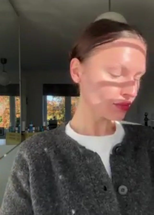A woman with dark hair pulled back in a bun, wearing a gray cardigan over a white t-shirt, takes a sip from a glazed ceramic mug with brown, orange, and cream stripes. The mug has a textured surface. She is indoors, with sunlight creating striped shadows across her face. A window and a partial view of trees with autumnal leaves are visible in the background. Also visible are a light fixture and a mirrored surface.