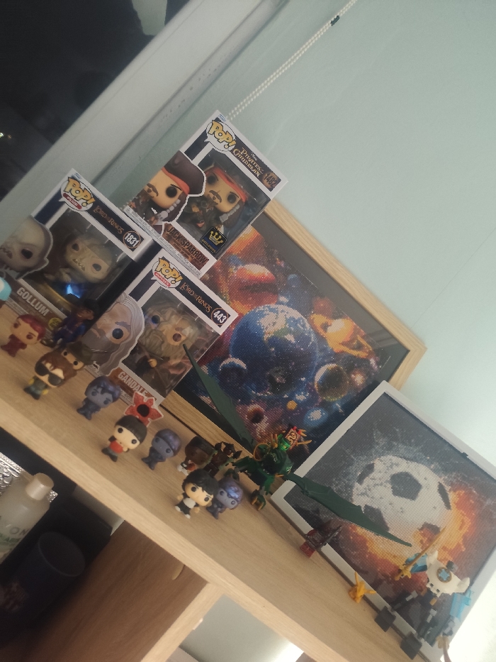The scene depicts a static arrangement of collectible items displayed on a light-colored wooden shelf within an indoor setting in Dimitrovgrad, Bulgaria. The background wall is painted a light, muted blue-green, with a partial view of a window or door frame and a white cord from a blind visible in the upper left. Arranged on the shelf, from left to right, are three boxed Funko Pop! figures: "Gollum" from *The Lord of the Rings* (number 1831), "Jack Sparrow" from *Pirates of the Caribbean* (number 1482), and "Gandalf" from *The Lord of the Rings* (number 443). In front of these boxed figures, a row of approximately ten smaller, unboxed collectible figures are positioned, including a distinctive red Demogorgon character and several stylized humanoid figures. Behind these figures, two framed diamond art paintings lean against the wall: a larger, central painting illustrates a vibrant cosmic scene with multiple planets and nebulae in blue and orange tones, while a smaller, square painting to its right features a white soccer ball against a background of orange and red explosive or fiery elements. Further to the right on the shelf, various small toy figures, including a green winged dragon-like creature and several other miniature Lego-style characters, are arranged. On the far left of the shelf, a white bottle, possibly containing a liquid, and a dark cylindrical object are partially visible. No individuals are present in the image, and no actions or interactions are occurring.