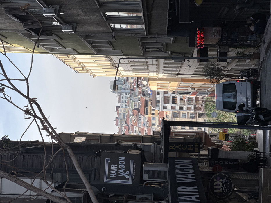 The image depicts a downward-sloping urban street in Şişli, Turkey, flanked by multi-story buildings and leading to a dense cityscape in the background under a pale blue sky. On the left side of the street, a dark, weathered multi-story building features two black signs with white lettering reading "HAIR VAGON" and "HAIR DESIGNER." Below these, a white external air conditioning unit is mounted. Further down, a circular "LUX Beauty Nail Bar" sign is partially visible, and a vertical sign for "RACH HOTEL" can be seen. A single individual is seated on a stool outside a doorway near the "LUX" sign. Bare tree branches with sparse dry leaves extend into the upper left foreground. On the right side of the street, a multi-story building with a light green-gray, textured facade has multiple windows and several external air conditioning units. A black street lamp pole with a horizontal light fixture stands in the midground. Below the light fixture, a red illuminated sign displays fragmented Turkish text, reading "MEŞR... ÇEŞİTLERİ." Further down the street on the right, two individuals are seated at a table outside a building. In the center of the street, a white panel van, bearing the Turkish license plate "77 ADS 951," is parked facing downhill. Immediately in front of the van, a black motorcycle or scooter is parked on the left side of the street. The street surface appears to be asphalt. The background features a multitude of residential and commercial buildings with varying architectural styles and predominantly reddish-brown tiled roofs, extending into the distance under a clear sky. A small, dark, airborne object is discernible in the sky above the distant buildings.