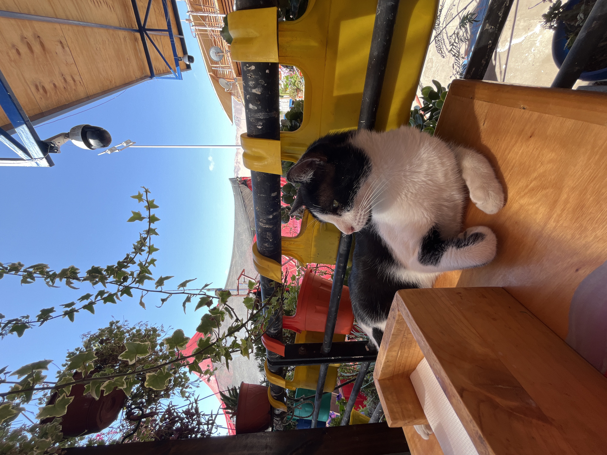 The image depicts a black and white cat resting on a wooden surface, possibly a shelf or table, situated outdoors. The cat is curled up, its white fur prominent, with black patches on its head and body. The wooden surface appears to have a built-in paper towel dispenser. The background reveals a colorful, eclectic scene with various objects. There is a structure made of black metal rods, with yellow, orange, and other colored plastic components attached, possibly used for decoration or as part of an outdoor setup. Several potted plants with green foliage are hanging or positioned nearby. Above, there is a blue sky, and a security camera mounted on a pole. The scene is rotated such that the sky is on the left side of the frame. The location is Unknown, Unknown.