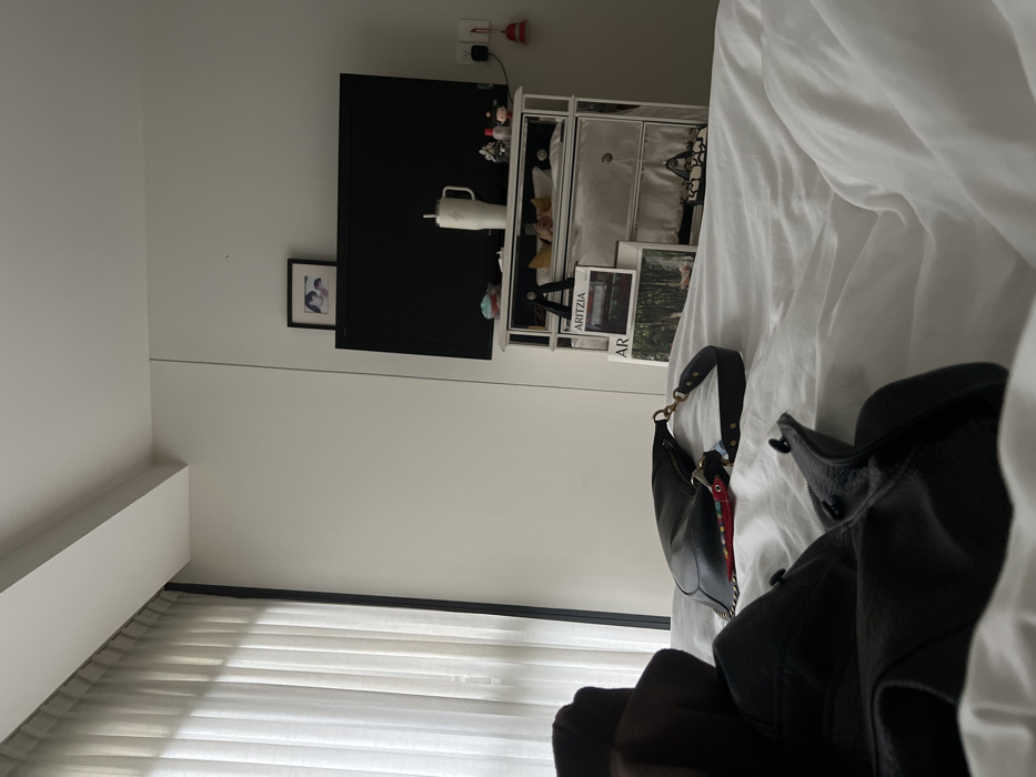 A bedroom scene features a flat-screen TV mounted on the wall beside a white storage unit. The unit displays books and various items. A framed photo hangs below the TV. White curtains cover a window. A black purse with a colorful strap sits on the bed, near a jacket. White sheets dominate the foreground.