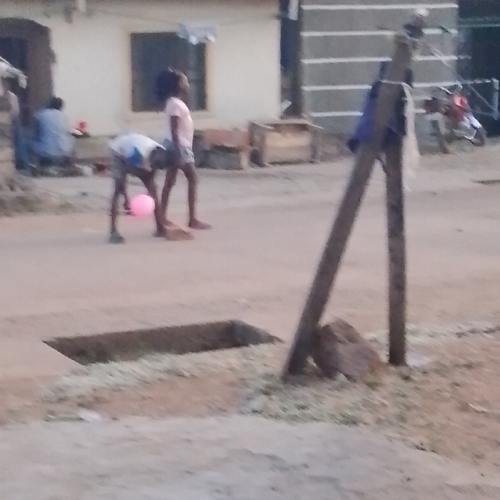 A dirt road has a rectangular hole near the left side of the frame. A post and a couple of rocks are near the right side of the frame. In the background, two children stand next to each other. One child leans over with a pink balloon. A house with a window is in the background. A motorcycle is further in the distance.