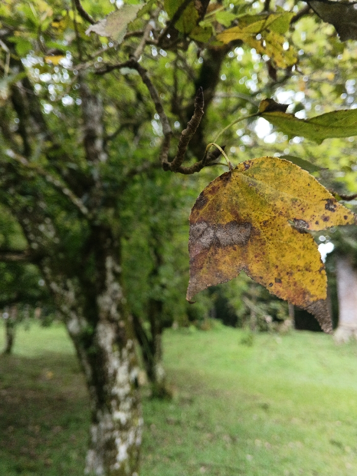 - "A single, distinctly discolored deciduous leaf, predominantly yellow with significant brown and reddish-brown necrotic patches, hangs from a thin, dark branch in the foreground, sharply in focus" by FM-ffcoN2, licensed under CC BY 4.0