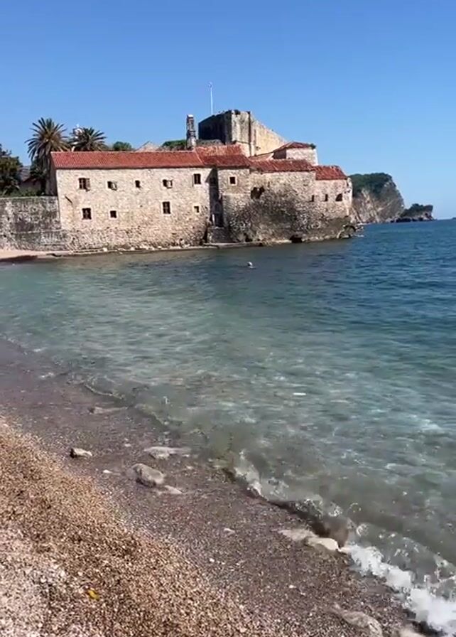 sunny day at a beach near a stone fortress in Budva, Montenegro