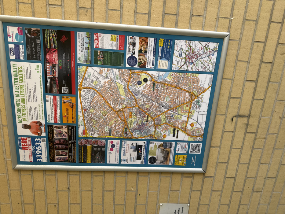 A rectangular, silver-framed information board is mounted to a brick wall. The board is covered with various advertisements and a large map. The map depicts the central area of Cambridge, UK. The map is predominantly yellow with orange lines indicating roads and street names printed in small, black lettering. There is a small, black circle marking a location on the map. The board is attached to a yellow brick wall. The top of the board includes the words "We're committed to a better quality of fitness and leisure facilities," a QR code, and a logo for "Better." The advertisement below shows a man with a microphone and the words "Macias." The advertisement below that features a woman with a laptop and the words "Tech." An advertisement below that reads "Travel Bugs & Cigars" and includes a picture of cigarettes and a QR code. The advertisement below that reads "28 Fitzroy Street." The advertisement below that includes the text "Mobile & Vape" and a picture of various vape devices. Below that, another advertisement includes the words "Fin Butchery & Restaurant." The board also contains a QR code and the words "Scan here for online version."