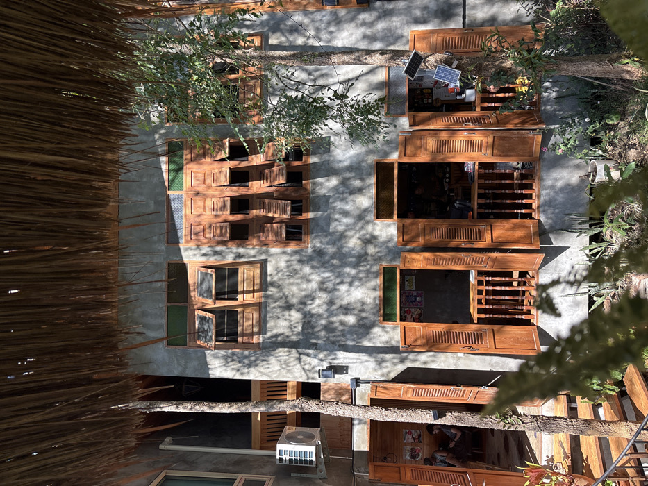 A bird's-eye view reveals a building with a concrete facade, adorned with numerous wooden windows featuring open shutters. Sunlight casts shadows across the scene, highlighting the rustic charm. A thatched roof overhangs the building on one side, while trees and foliage provide a natural frame on the other. An air conditioning unit is visible near the base of the building. Solar panels are mounted near an open window, indicative of sustainable technology integration.