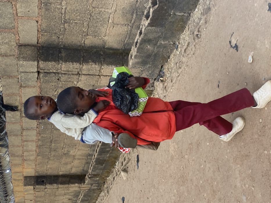 A young boy carries a smaller child piggyback style along a dirt path beside a brick wall