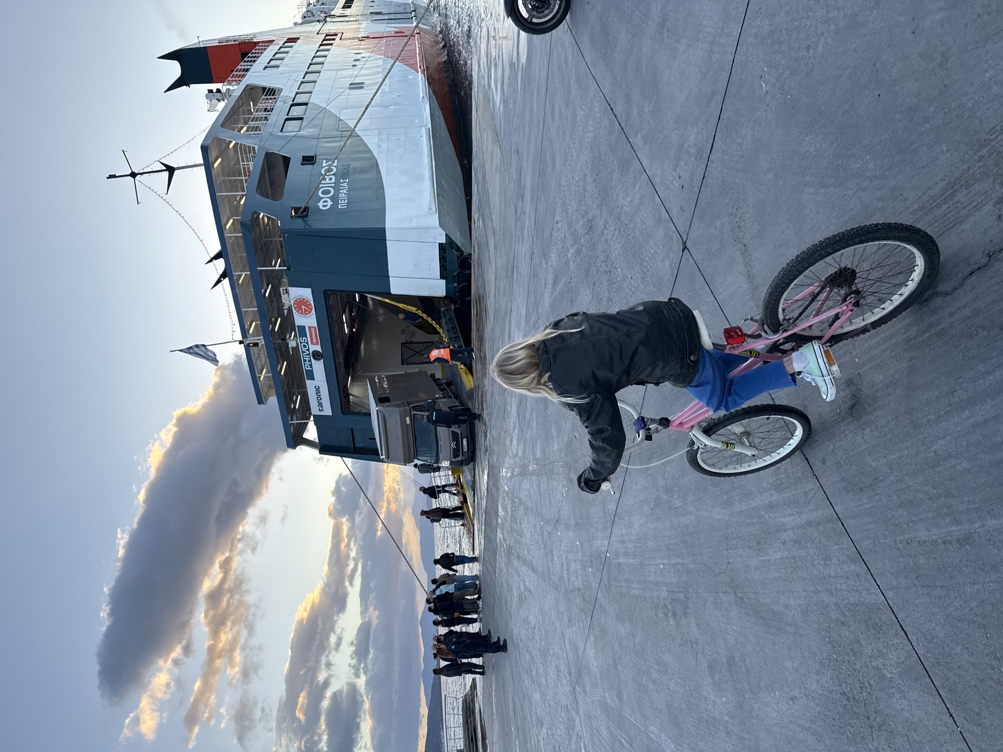 The image depicts Aegina Port, Greece, during late afternoon or early evening under a partly cloudy sky. In the foreground, a blonde-haired child, viewed from behind, rides a pink bicycle on a grey concrete pier. The child wears a dark jacket, blue pants, and light-colored sneakers, and faces a large vehicle and passenger ferry. The ferry, identified as "PHIVOS" (ΦΟΙΒΟΣ) and "SARONIC," is docked at the pier with its stern ramp lowered, connecting to the concrete surface. The ferry's hull features dark teal, white, and red sections, and displays "ΠΕΙΡΑΙΑΣ" (Piraeus). A Greek flag flies from the ferry's mast. A grey delivery van is positioned on the ferry ramp, with an individual in an orange safety vest standing nearby. Another person in a dark uniform is also visible on the ramp. Approximately 15 to 20 individuals are gathered on the pier near the ramp, consistent with embarkation or disembarkation procedures. Distant mountains are visible across the water on the horizon. A portion of a motorcycle's front wheel is visible on the right edge of the pier.