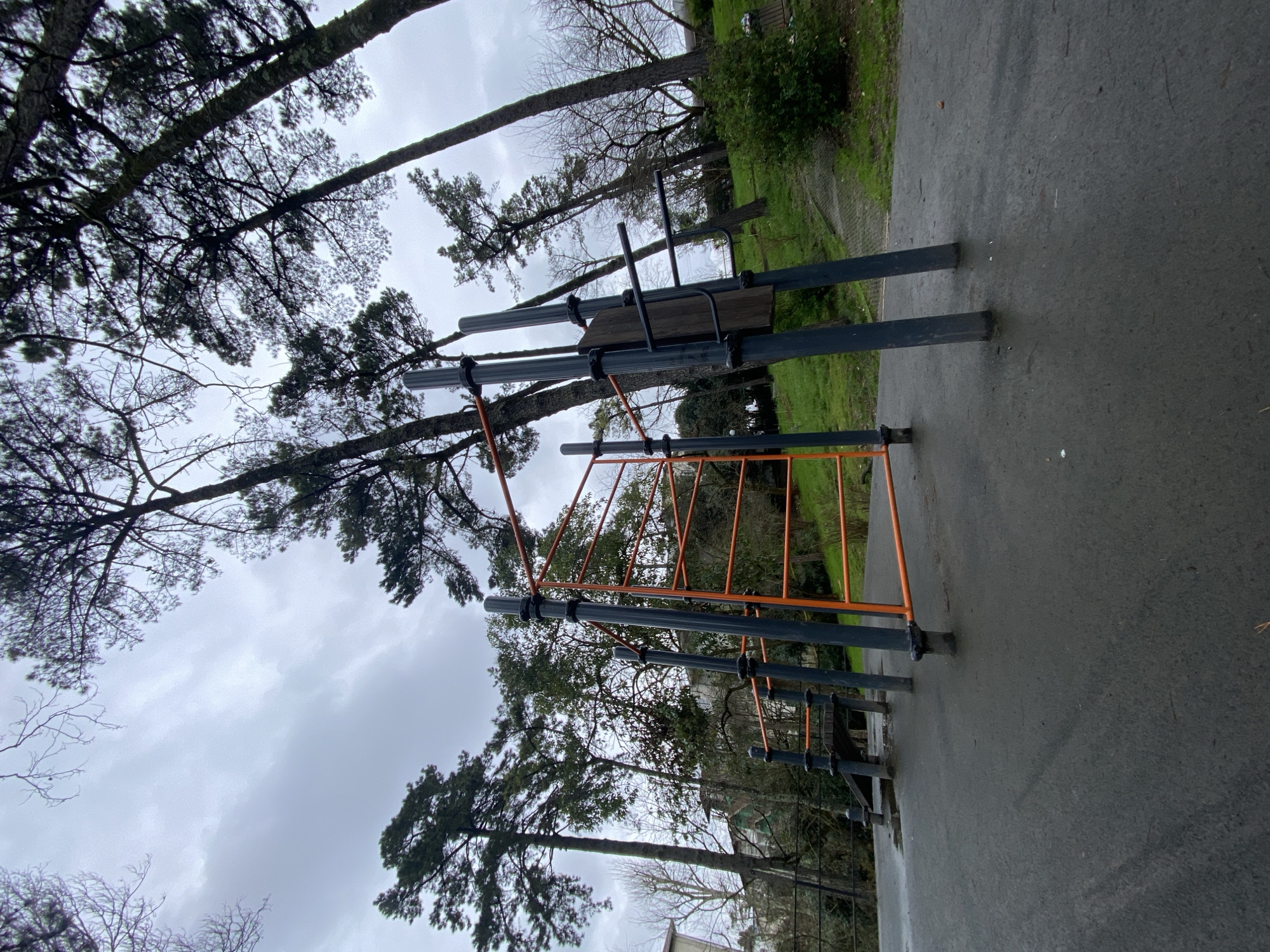 Outdoor fitness equipment stands on a grey concrete surface, flanked by trees with sparse foliage against a cloudy sky