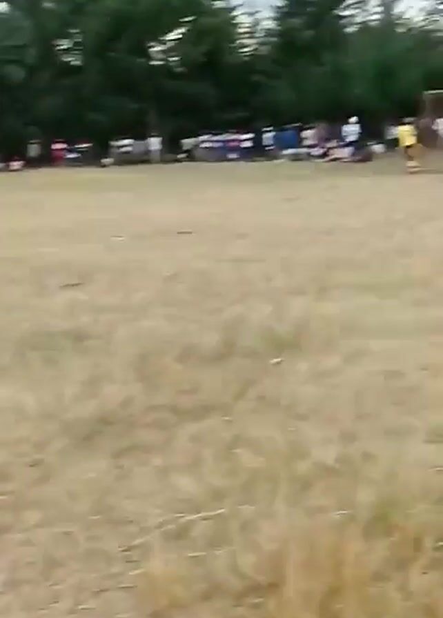 A soccer game on a field with dry grass is shown. Players in blue and white and yellow and black run across the field, kicking the ball. There is a goal at the end of the field, with a crowd of people standing behind it watching the game. There are tall trees in the background.