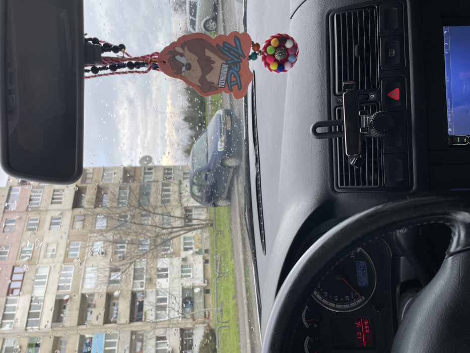 The image depicts a scene viewed from inside a vehicle, looking through a rain-splattered windshield at a residential street in Sofia, Bulgaria. In the foreground, the vehicle's black steering wheel is visible on the left, partially obscuring the instrument cluster which displays an external temperature of 8.5°C, an odometer reading of 201,189 km, and a trip meter of 1,596 km. A black phone mount is affixed to a central air vent on the dashboard, above a visible red triangular hazard light button. Hanging from the rearview mirror are a "Tasmanian Devil" character air freshener, a strand of black beads, and a multicolored spherical charm. The exterior scene reveals a large, multi-story concrete panel apartment building in the background, featuring numerous windows and balconies, characteristic of Sofia's residential districts. A bare-branched tree stands in front of the building on a grassy strip. A blue compact car is parked on a paved surface to the right of the tree, partially obscuring a low metal barrier. A second, lighter-colored vehicle is partially visible parked further down the street to the right. The sky is overcast.