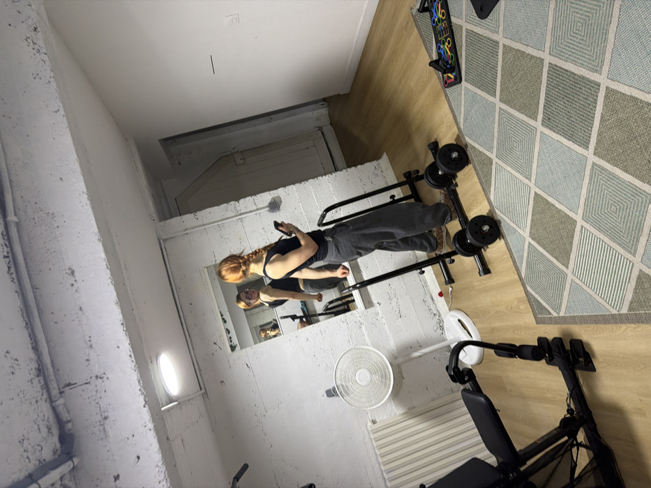 An indoor space contains a woman in a black tank top and grey pants holding a phone, standing next to a weight rack. A mirror reflects her image. The room features a textured grey wall, a white fan, and a workout bench. A patterned rug lies on a wood floor. There are dumbbells on the rack, and a fitness equipment storage rack is visible.