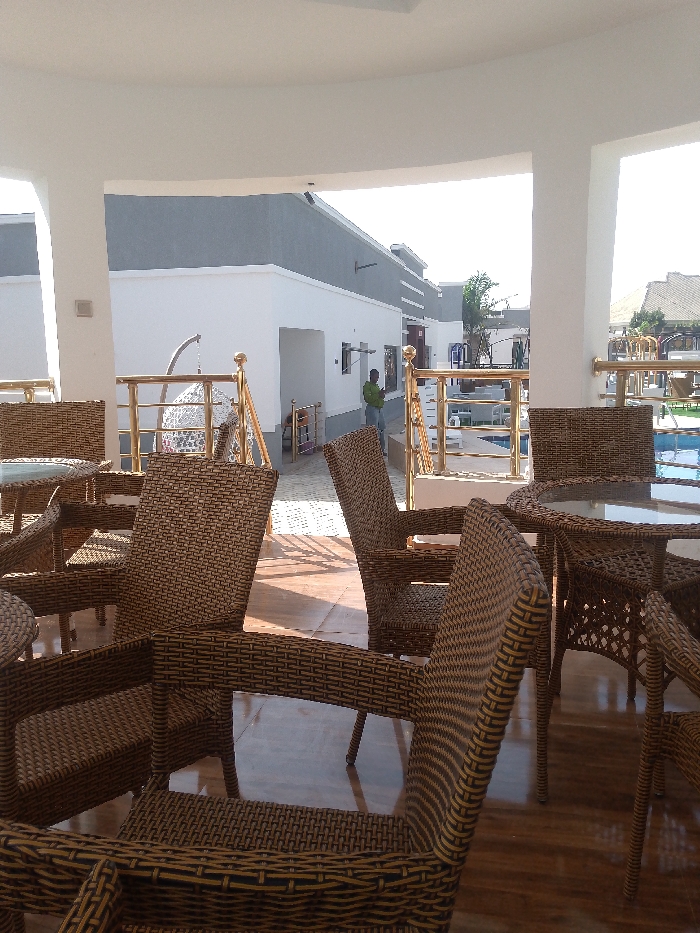 The image depicts a semi-outdoor patio area, likely part of a hotel or resort, located in the city of Unknown, Unknown, under bright daylight