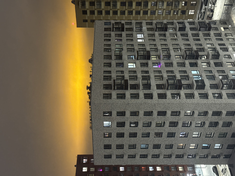 A low-angle shot captures the facades of several buildings against a dusk-lit sky. The primary building is tall and gray, adorned with a grid of windows and dark balconies. Above, a taller, lighter-colored building with similar window patterns looms. Below, a shorter, reddish-brown building provides contrast. The sky transitions from a hazy gray to a bright golden hue. The image is rotated slightly, giving a tilted perspective.