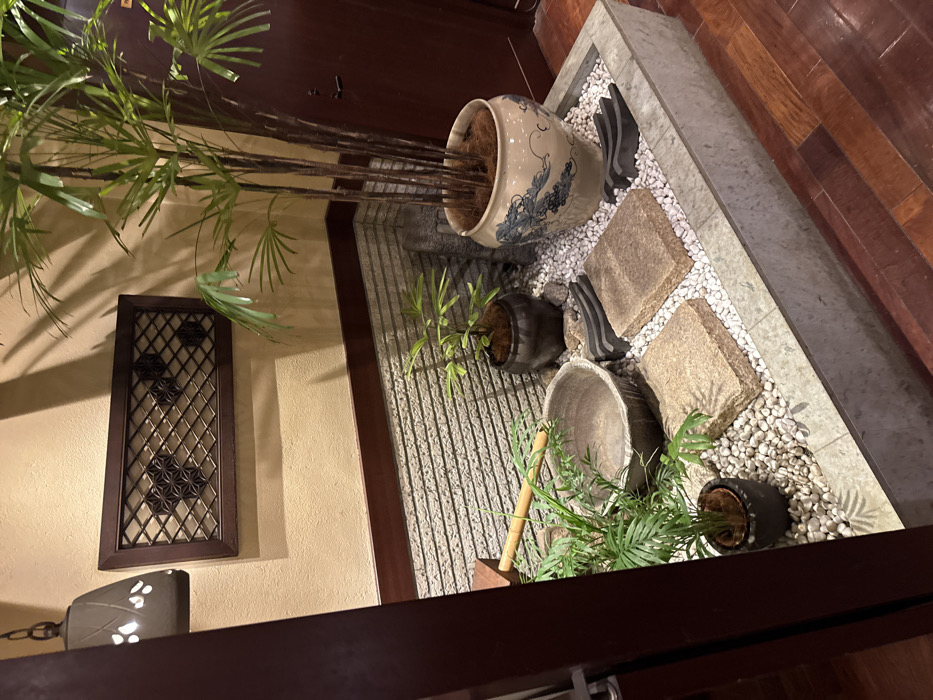 The image depicts an indoor decorative garden area, characteristic of a Japanese establishment, located in Shibuya, Japan. The scene is presented from a slightly elevated, oblique angle. In the foreground, a dark reddish-brown vertical architectural element frames the left side of the image. The floor consists of polished dark wood planks. The central subject is a raised rectangular garden bed, approximately 1.5 meters long, with low concrete-like walls. This bed is filled with small, light-colored pebbles. Within the pebble bed, various elements are arranged: * On the left, a small green plant in a dark pot. * To its right, a large, shallow, grey stone basin, partially obscured, appears to be part of a water feature, with a horizontal bamboo spout extending towards it from the upper left. * Two rectangular, light brown, rough-textured stepping stones are centrally placed on the pebbles. * Further right, two dark grey, curved, wedge-shaped objects rest on the pebbles. * In the back right corner of the bed, a large cream-colored ceramic pot with blue wave or cloud motifs contains a tall, multi-stemmed plant with long, slender green leaves. * Behind the stepping stones, a smaller dark pot holds another green plant. * A slender, vertical grey stone pillar stands behind the larger plant pot. The background wall is sectioned horizontally. The lower section features grey, horizontally grooved stone or tile work, topped by a dark brown wooden trim. Above this, the upper wall is painted a smooth light tan color. A rectangular dark brown wooden frame with intricate lattice patterns and four circular decorative motifs is mounted on the upper wall. On the far left, a dark, bell-shaped hanging lamp with decorative cut-outs is suspended from the ceiling. On the far right, a dark brown wooden door with a handle is visible. Shadows from the plants and overhead lighting are cast onto the wall and pebbles. No individuals are present in the scene.