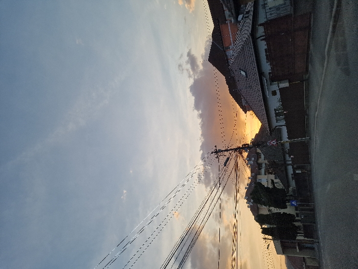 The scene depicts an urban street in Odorheiu Secuiesc, Romania, during the late evening or sunset. The sky transitions from light blue overhead to orange and yellow at the horizon, with scattered grey-orange clouds and faint wispy contrails. A dense network of black electrical and communication wires diagonally crosses the upper frame, originating from a dark wooden utility pole situated centrally on the right side of the road. The foreground features an unoccupied asphalt road, curving slightly to the right, with a faint white line marking visible on its surface. To the left, a light-colored building is partially obscured by three tall, dark columnar trees and a dark fence. Behind this, a multi-story building with a red-tiled roof and multiple dormers is visible. To the right, several residential structures with brown and red-tiled roofs and dark fences line the road. One prominent white-faced house with a brown tiled roof features a visible roof dormer or skylight. Blue and white street signs are present near the base of the utility pole and among the trees on the left. No individuals, vehicles, or active elements are observed in the scene.