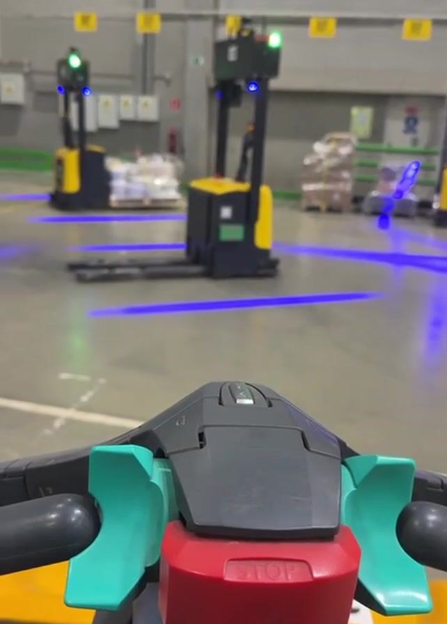 From the perspective of a person sitting on an industrial vehicle, possibly a pallet jack, the video shows a large warehouse-like space. The vehicle's control panel, featuring a red "STOP" button and teal-colored levers, is in the foreground. In the background are other similar electric vehicles with yellow and black coloring. These vehicles are stationary and have blue lights projected onto the floor around them. Pallets stacked with items, possibly wrapped, can be seen in the background as well. The floor is concrete and appears clean. The lighting is bright, and the overall atmosphere is industrial and organized.