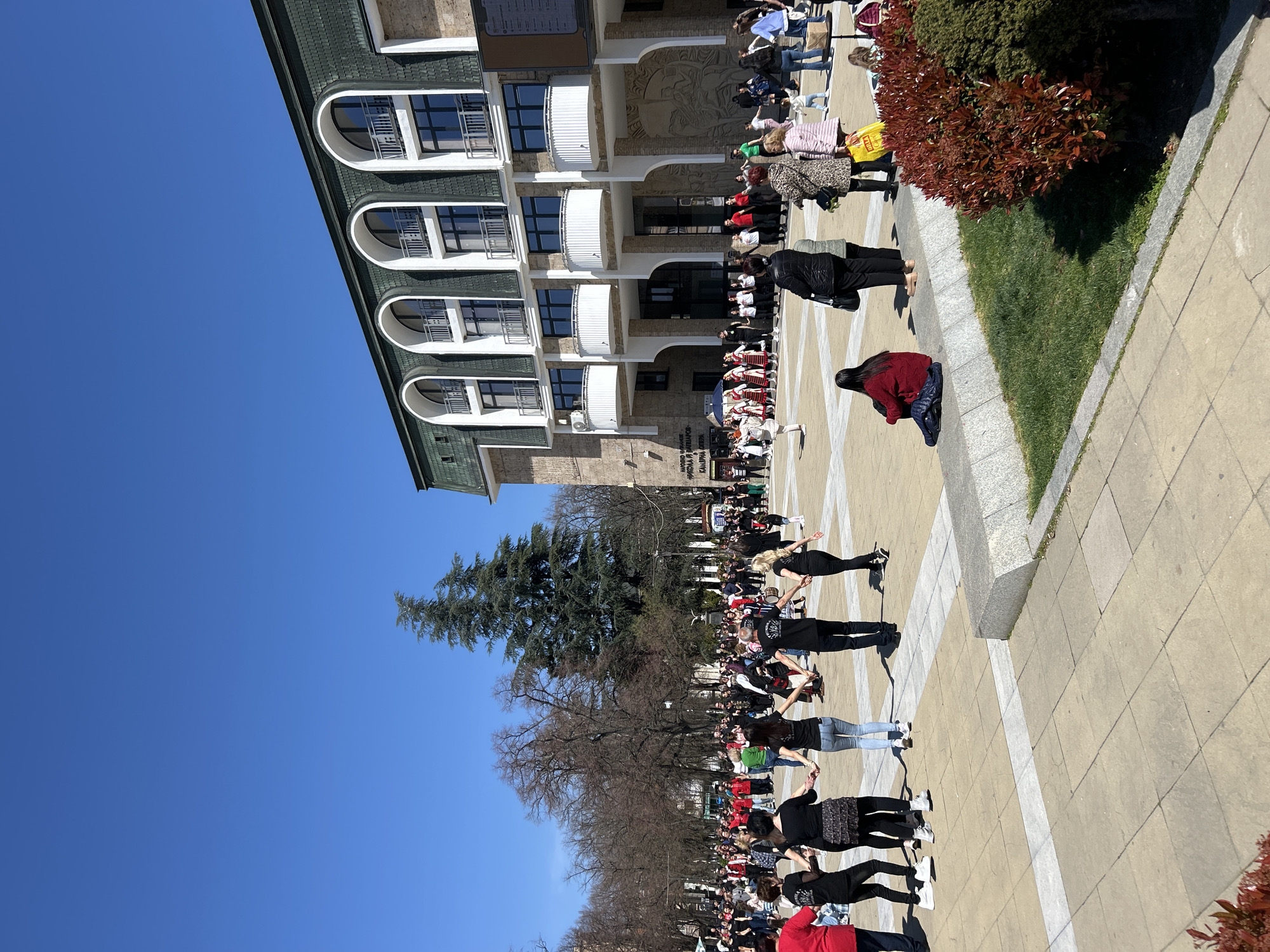 crowd of people holding hands, appearing to form a chain or line, in front of a large building. The building is multi-storied with arched windows and balconies, and a green roof. There is an engraved image above the building entrance. To the right of the building is a garden area with bushes and grass. The crowd stretches away from the building, with trees lining the walkway along which they stand. The people are dressed in various clothing, with some wearing traditional folk costumes. The scene is situated on a paved walkway or plaza. The sky is clear and blue. The building is identified as the National Library "Nikola Vaptsarov" in Blagoevgrad, Bulgaria. The people appear to be engaged in a traditional dance or celebration.