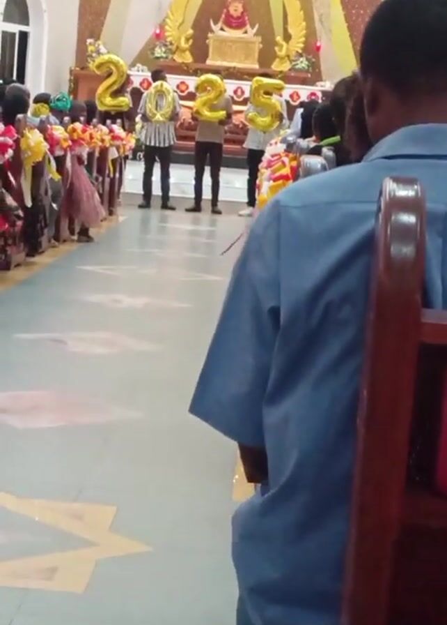 From a seated perspective in a church, the scene shows three individuals at the front of the aisle holding large golden foil balloons that spell out "2025." A line of people sit on each side of the aisle, facing the altar, some of whom have ribbons and flowers on their seats. The altar is ornate with a golden backdrop and a central religious figure. The floor features a geometric design, and light streams in from a window on the left. A person in a blue shirt sits in front of the camera.