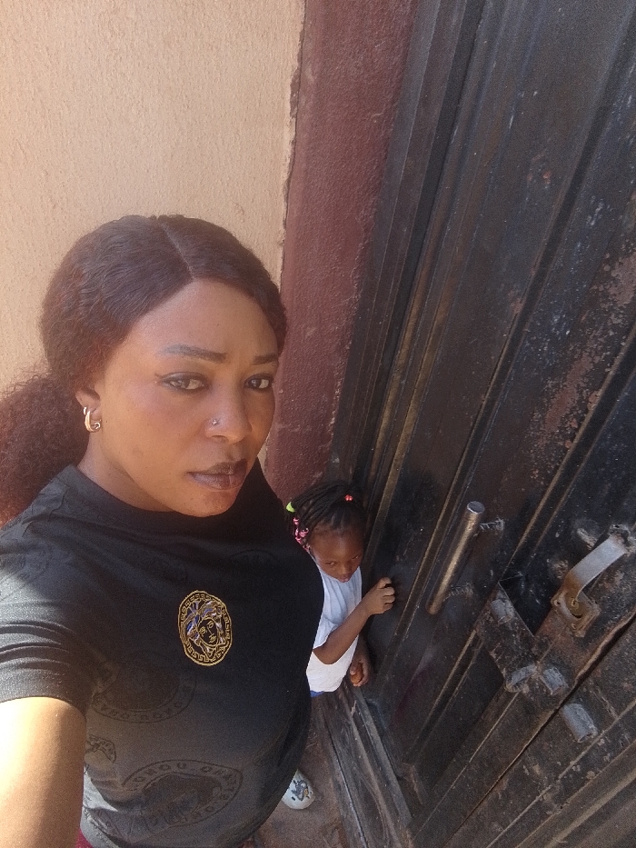 An adult female is captured in a vertical selfie-style image, with a young girl partially visible behind her. The scene takes place outdoors, possibly near an entrance or doorway, in the city of Unknown, Unknown. The adult female, positioned in the foreground and occupying the left half of the frame, has a light brown complexion and dark, wavy hair styled with a center part and gathered into a ponytail on her left side. She wears a black short-sleeved t-shirt featuring a circular gold and blue emblem on the left chest, resembling a Medusa head. A small metallic stud is present in her left nostril, and a gold-colored hoop earring adorns her left earlobe. Her gaze is directed straight towards the camera. Behind and to the right of the adult female stands a young girl, whose upper body is visible. She has a light brown complexion and her hair is styled in multiple small braids secured with colorful ties, including red, green, and yellow. She wears a white t-shirt. Her right hand rests on a dark, worn metallic door or gate, which occupies the right half of the image. The door/gate exhibits signs of wear and rust, featuring a vertical metallic handle or bar on its left panel and a rusted latch mechanism on its right panel. To the left of the door, a vertical strip of reddish-brown wall abuts a lighter, beige-colored wall that forms the background for the adult female. The scene is illuminated by natural light, indicating an outdoor setting during daytime.