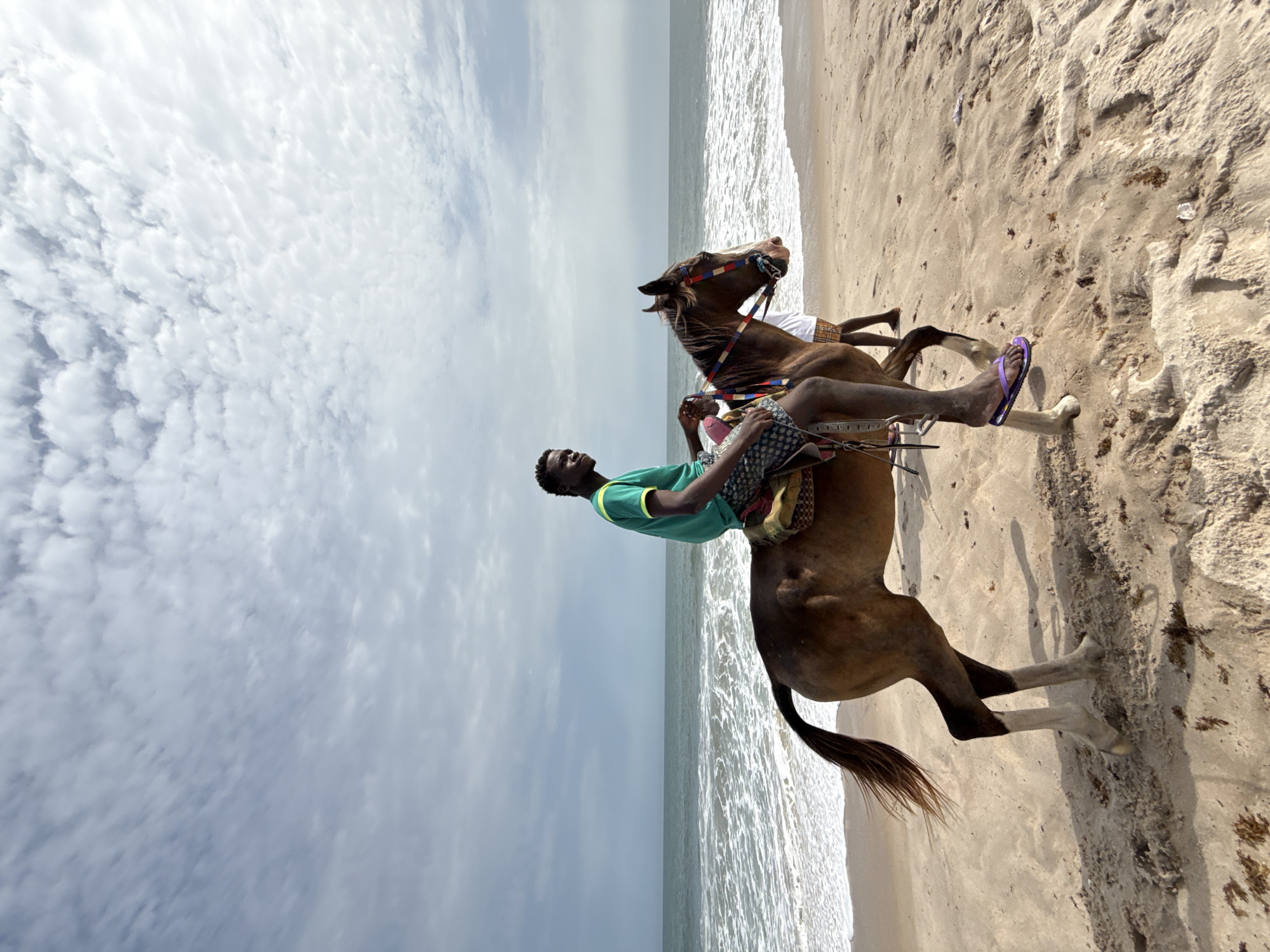 A man is riding a brown horse on a sandy beach in Mopo-Akinlade, Nigeria. The horse is facing the ocean. The man is wearing a green shirt, patterned shorts, and purple sandals. The sky is cloudy. The horse's legs are in motion. The ocean waves are visible in the background. The beach is sandy with some debris scattered on the surface.
