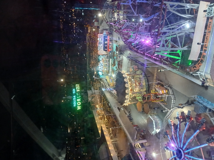 A nighttime view overlooks a brightly lit amusement park featuring roller coasters, a carousel, and a Ferris wheel. Green neon signage for "HOLIDAY PARK WORLD" is visible on the left. The scene is vibrant with artificial lights highlighting the rides and attractions. The image is captured from a high angle, suggesting a viewing platform or tall building.