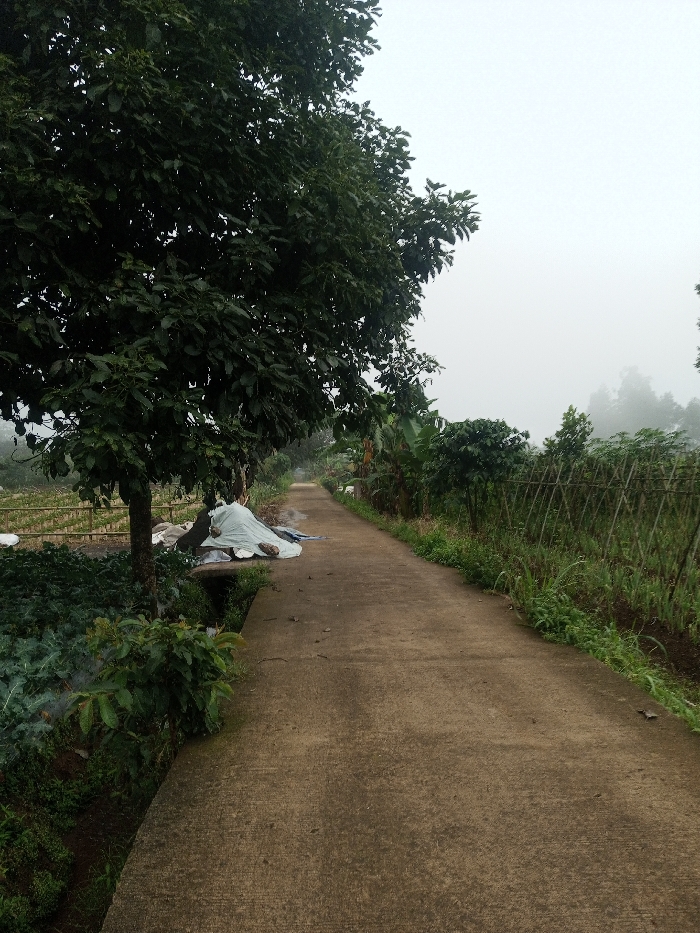 The image presents a concrete pathway extending into the distance under a misty, overcast sky in Joshi Vihir, India. On the left side of the pathway, a large tree with dark green foliage stands prominently. Below the tree, a vegetated drainage ditch runs parallel to the path. Beyond the ditch, a cultivated field with rows of green plants is visible. Near the base of the large tree and beside the ditch, a pile of indeterminate objects is covered by light-colored tarpaulins, with some darker material visible beneath the sheeting. On the right side of the pathway, dense green vegetation, including smaller trees and broad-leafed plants, borders the path. Further into the field on the right, a structure composed of vertical and horizontal bamboo poles forms a trellis. The background is obscured by heavy fog or mist, blending with the sky. No individuals or animals are present.
