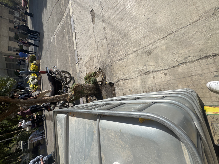 The image portrays an outdoor street scene under bright sunlight in Rukn ad-Din Municipality, Syria. In the immediate foreground on the left, a large, silver-grey Intermediate Bulk Container (IBC) with a metal cage frame is prominently positioned, partially obscuring the lower left view. A yellow object is visible beneath the IBC, and the tips of white slip-on shoes are visible at the bottom right, indicating the photographer's perspective. The ground transitions from a concrete sidewalk, which exhibits cracks, wear, and patterned sections, to an asphalt roadway. A tree with a thick trunk, exposed roots, and some green growth at its base is located on the sidewalk. A dark-colored motorcycle, equipped with a red object on its rear rack, is parked next to the tree, oriented towards the left. Across the asphalt road, a series of raised flowerbeds filled with yellow and white flowering plants are present. Beyond these, numerous individuals are visible throughout the mid-ground and background. Several people are seated on benches under trees on the far left, while other groups stand and walk along a distant sidewalk and near the flowerbeds. One individual in a white top on the left appears to be gesturing or pointing. In the background, various buildings are visible, including a large structure with a distinctive facade. A light-colored car is partially visible parked on the far left, and a red vehicle is partially visible on the far right. The scene is illuminated by strong sunlight, casting distinct shadows from trees and people.